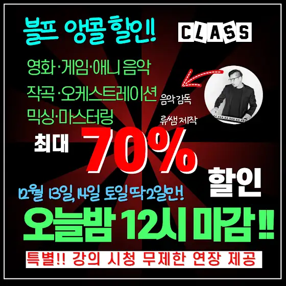 음악·사운드 감독 류쌤입니다. 블프 앵콜 최대 70% 할인을 진행합니다.