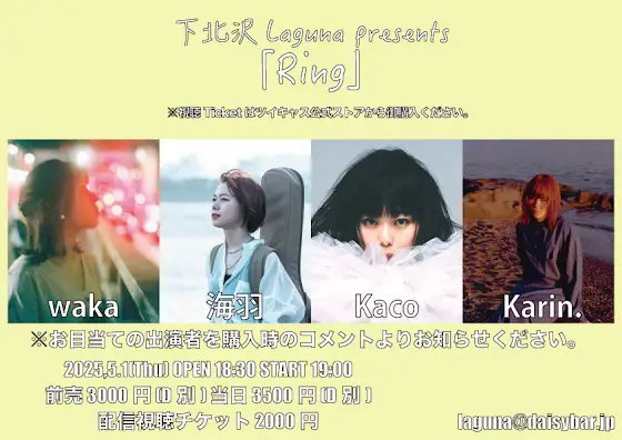 5月1日(木)に下北沢Lagunaにて開催される「Ring」に弾き語りで出演します。下記サイトにてチケット予約、配信チケットを販売しておりますので、是非お越しください。karin-official.com/event-details/…