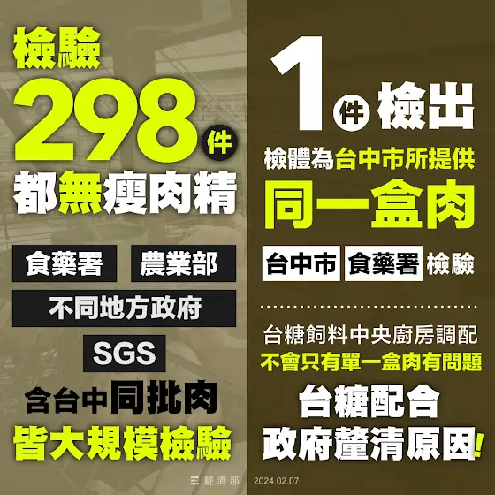 ① 從2/2台中檢出西布特羅開始,中央的農業部、衛福部,各地方政府都大規模檢驗,台糖也送驗給SGS,肉品、血液、飼料,還有跟台中這盒肉「同一批肉品」,都經大規模檢驗,298件都沒有瘦肉精。