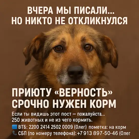 😭 Мы писали вчера… но никто не откликнулся.Просто тишина.Ни рубля. Ни слова. Ни реакции.А корм тогда уже почти закончился.СЕГОДНЯ ЕГО НЕТ СОВСЕМ.Вообще.Просто стоим перед мисками… и молчим.250 животных. И нечего дать.Мы не знаем, как это пережить.Как смотреть им в глаза.Как открывать дверь вольера, когда в руках — пусто.Они не понимают, что сбор был ПРОВАЛЕН.Они просто ЖДУТ. Верят. Надеются.А мы… ПРОСИМ. СНОВА.Мы не собираем на что-то “крутое”.Мы не хотим жалости.Нам просто нужно прокормить 250 хвостов.СЕГОДНЯ. Иначе — голод.Если ты видишь этот пост — пожалуйста…ХОТЬ ЧТО-ТО.Хоть 50 рублей. Хоть 100.Каждая копейка — это корм. Это жизнь. Это не "жалко", это шанс.🟦 ВТБ: 2200 2414 2502 0009 (Олег)пометка: на корм📞 СБП (по номеру телефона):+7 913 897 50 46 (Олег)Сделай репост. Напиши комментарий. Помоги — как можешь.Мы просто больше не знаем, что делать…Они голодают. А мы срываемся.Прости, что снова просим… но без вас — НИКАК. 💔