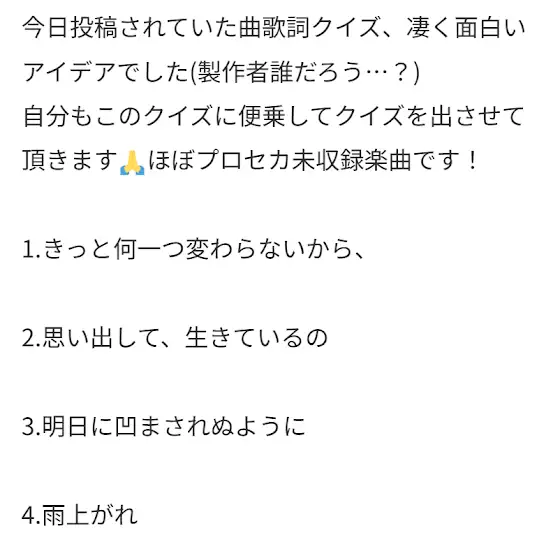 【楽曲クイズ!!】今回は歌詞クイズ!!超最近のから古のボカロ曲まで幅広い!!!なんなら初めて知った曲も結構ありましたし難易度高いと思います今回...!