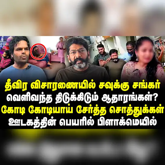 https://youtu.be/gCg3GFLThxk தீவிர விசாரணையில் சவுக்கு சங்கர் | கோடி கோடியாய் சேர்த்த சொத்துக்கள் | Selva | Savukku sankar |