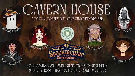 STARTING SOON: Cavern House creepy DND one shot! I've been enjoying the creative process of creating characters and playing this new to me game. I'd love for you to hang out with me and some friends while we play and fundraise too!twitch.tv/northofsleepy