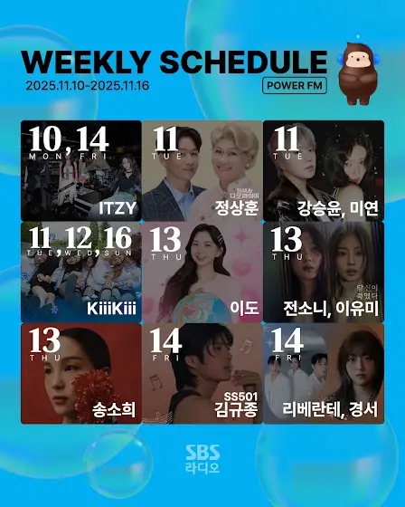 <에라오 알림장📍>📻SBS 파워FM 107.7MHz📻✨11/10(월) ~ 11/16(일) 위클리 게스트✨⠀✔월요일웬디의 영스트리트 - *스페셜 DJ #채령 #ITZY #있지⠀✔화요일박하선의 씨네타운 - #정상훈 (뮤지컬 '미세스 다웃파이어')두시탈출 컬투쇼 - #강승윤 #미연웬디의 영스트리트 - *스페셜 DJ #채령딘딘의 Music High - #KiiiKiii #키키 이솔 수이⠀✔수요일두시탈출 컬투쇼 - #홍경민웬디의 영스트리트 - *스페셜 DJ #채령 #KiiiKiii #키키⠀✔목요일김영철의 파워FM - #이도12시엔 주현영 - #전소니 #이유미 (시리즈 '당신이 죽였다')두시탈출 컬투쇼 - #송소희웬디의 영스트리트 - *스페셜 DJ #채령⠀✔금요일이인권의 펀펀투데이 - #김규종 #SS50112시엔 주현영 - #리베란테 #경서두시탈출 컬투쇼 - #신유진 변호사웬디의 영스트리트 - *스페셜 DJ #채령 #ITZY #있지⠀✔토요일두시탈출 컬투쇼 - #흰 #벤웬디의 영스트리트 - *스페셜 DJ #채령⠀✔일요일두시탈출 컬투쇼 - #KiiiKiii #키키박소현의 러브게임 - #CRAVITY #크래비티 정모 민희 형준웬디의 영스트리트 - *스페셜 DJ #채령배성재의 텐 - #이재율 #강현석⠀#SBS라디오 #파워FM #SBS라디오스케줄 #SBS파워FM #SBS #라디오(※ 자세한 스케줄은 각 프로그램 홈페이지 및 인스타그램 참조 부탁드립니다.)