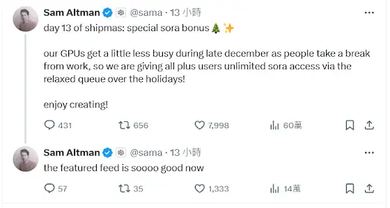 沒太多人講的 day13🎅...Plus 用戶自己靜靜地玩就好了🎄來源: x.com/sama/status/1870524745302839559