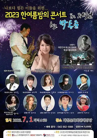 2023한여름밤의콘서트에 초대합니다장소 : 제천시문화회관 대강당일시 : 7월1일 저녁6시50분~티켓 : 25,000원예매문의 : 010-8287-2308 가수 조재권