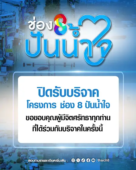 ขอบคุณแฟนข่าว สรุปโครงการ “ช่อง 8 ปันน้ำใจ” เพื่อผู้ประสบอุทกภัยภาคใต้ ช่อง 8 เปิดรับบริจาคตั้งแต่วันที่ 25 พฤศจิกายน 2568 เพื่อช่วยเหลือประชาชนที่ประสบอุทกภัยภาคใต้ -ได้รับความร่วมมือจากประชาชน จำนวนรวมทั้งหมด 9,509,237.66 บาท (วันจันทร์ที่ 22 ธันวาคม 2568 ) รายละเอียดการดำเนินงานงบประมาณ 9,509,237.66 บาท ในการ ช่วยเหลือประชาชน-มอบเงิน 1,000,000 บาท ให้แก่ โรงพยาบาลหาดใหญ่ -มอบเงิน 1,000,000 บาท ให้แก่ สภากาชาดไทย พร้อมจัดอาหารพร้อมทาน-มอบเงิน 1,000,000 บาท ให้แก่ มูลนิธิอาสา เพื่อพึง (ภาฯ) พร้อมตั้งโรงครัว-สนับสนุนอุปกรณ์ฟื้นฟู มูลค่า 500,000 บาท ให้แก่ ร.ล.จักรีนฤเบศร -มอบเงิน 500,000 บาท ให้แก่ มูลนิธิองค์กรทำดี โดย ดร.ปนัดดา วงศ์ผู้ดี เพื่อสนับสนุนอุปกรณ์กู้ภัย-มอบอาหาร/สิ่งของจำเป็น รวมมูลค่า 1,500,000 บาท ณ ศูนย์พักพิงร่วม มทบ.42-มอบเงิน 1,600,000 บาท ให้แก่ โรงพยาบาลสนาม 8 แห่ง ช่วยเหลือ/รักษาผู้ประสบอุทกภัย-มอบเงินมูลค่ารวม 2,358,504 บาท ให้โรงเรียน 12 โรง ในพื้นที่ จ.สงขลา ที่ได้รับผลกระทบขั้นรุนแรงประกาศปิดรับบริจาค ตั้งแต่วันจันทร์ที่ 22 ธันวาคม 2568-เพื่อความเป็นระบบและโปร่งใส ช่อง 8 ขอประกาศ ปิดรับบริจาคอย่างเป็นทางการ ในการทำความดี เพื่อพี่น้องประชาชนในครั้งนี้ โครงการ “ช่อง 8 ปันน้ำใจ” เพื่อผู้ประสบอุทกภัยภาคใต้ ขอกราบขอบพระคุณพี่น้องประชาชน และแฟนข่าว ที่ร่วมเป็นพลังแห่งการแบ่งปันน้ำใจครั้งนี้ จึงขอเรียนมายังผู้มีจิตศรัทธาทุกท่านได้ทราบโดยทั่วกัน