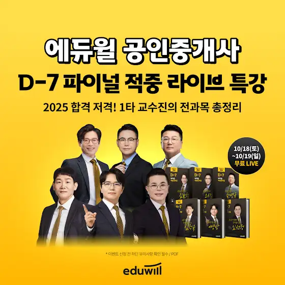 10/18(토) + 10/19(일) 하루 3과목씩, 완벽 끝장! 전과목 총정리 특강 알림 신청 👉 eduwill.kr/poHp 2025 합격 저격! 1타 교수진의 D-7 파이널 적중 라이브 무료✨ 📍전 과목 핵심 내용을 빈틈없이 총정리 📍시험에 꼭 나오는 빈출 개념 집중공략 10/18(토) : 학개론, 민법, 중개사법 10/19(일) : 공시법, 세법, 공법 D-7 파이널 적중 라이브 특강 신청자에게만!! 공인 중개사 🎁합격 지원 혜택 100% 제공🎁 💛적중요약집 PDF & 수강할인권💛 사전신청하고 무료 혜택 받기 👉 eduwill.kr/poHp #공인중개사 #공인중개사라이브특강 #공인중개사마지막승부 #공인중개사시험 #공인중개사실전대비 #공인중개사2025 #공인중개사합격 #공인중개사합격