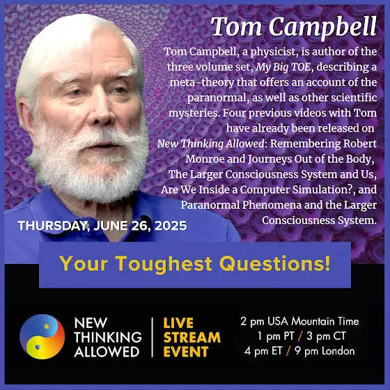 Mark your calendar for Thursday, June 26, at 2 pm (USA Mountain Time), 1 pm (Pacific Time), for a Live Stream Event with Tom Campbell. Tom Campbell, a physicist, is author of the three volume set, My Big TOE, describing a meta-theory that offers an account of the paranormal, as well as other scientific mysteries. Four previous videos with Tom have already been released on New Thinking Allowed: Remembering Robert Monroe and Journeys Out of the Body, The Larger Consciousness System and Us, Are We Inside a Computer Simulation?, and Paranormal Phenomena and the Larger Consciousness System.