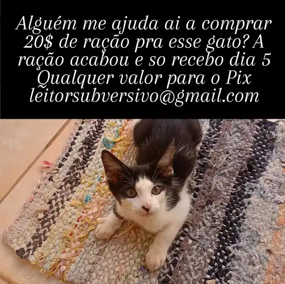 Alguém me ajuda ai a comprar 20$ de ração pra esse gato? A ração acabou e so recebo dia 5 Qualquer valor para o Pix leitorsubversivo@gmail.com