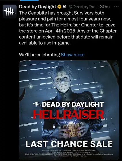 DBD:Well huge unfortunate news. Pinhead will be leaving dbd (similar to when Stranger Things left). You have 1 month to buy him or any of his cosmetics.#dbd
