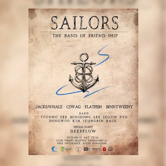 SAILORS: THE BAND OF FRIEND SHIP”'세일러스 : 밴드 오브 프랜드쉽’ 콘서트에 여러분을 초대합니다.일시 : 2025.09.13 (토)시간 : 18:30 ~ 20:30 장소 : 홍대 클럽온에어 (서울특별시 마포구 잔다리로 44 1층)입장료 : 무료입장 / 퇴장 후원(사전 후원, 익명 후원 가능)*후원 계좌 : 100-162-176637 케이뱅크 안준세※ 후원은 필수사항이 '절대 아닙니다' 부담없이 자유롭게 오셔서 재미있게 관람 해주시기 바랍니다! -LINE UP-[ARTISTS] 잭앤웨일 / C.Swag / 광어 / 비니위니@whalestyle27 @cswagofficial @flatfish._.selfish @binnyweeny[BAND]BASS: 이윤호 / @yh_o3zzGUITAR 1 : 김동우 / @kimdngwooGUITAR 2 : 백승빈 / @10s.0bDRUM: 이민성 / @minseong8576KEYBOARD: 표서진 / @xeojjini2_[SPECIAL GUEST]DEEPFLOW(딥플로우) @deepflow39이번 콘서트는 지구상에서 가장 쿨한 에너지 음료 '몬스터 에너지' @monsterenergy합정 No.1 힙합 라운지 '교집합' @gyoziphop_글로벌 열전사 바이닐 컴퍼니 '민서 코팅 플렉스' @minseocoatingflex당신의 꿈을 담는 비디오 워크 스테이션 '플로우매스' @flowmass_production와 함께 합니다