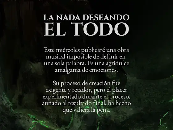 Este miércoles 10 lanzaré el tema que más he disfrutado componer este año. Se publicará en mi otro canal: Green A.