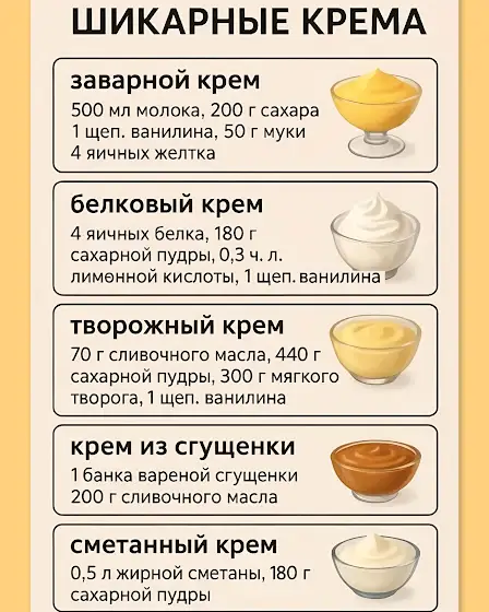 🔥 ТОП-5 ШИКАРНЫХ КРЕМОВ ДЛЯ ТОРТОВ И ДЕСЕРТОВ 🍰1. 🍮 Заварной крем📌Ингредиенты:500 мл молока, 200 г сахара, 50 г муки, 4 желтка, щепотка ванилина.📌Приготовление: 1. 🥣 Смешайте желтки, сахар и муку. 2. 🥛 Влейте тёплое молоко, размешайте до однородности. 3. 🔥 Варите на медленном огне, помешивая, пока не загустеет. 4. 🌸 Добавьте ванилин и остудите.2. ☁️ Белковый крем📌Ингредиенты:4 белка, 180 г сахарной пудры, 0,3 ч. л. лимонной кислоты, ванилин.📌Приготовление: 1. 🥣 Взбейте белки до пены. 2. ➕ Добавьте сахарную пудру и лимонную кислоту. 3. 🔥 Взбивайте на водяной бане до плотных пиков. 4. 🌼 В конце добавьте ванилин.3. 🧀 Творожный крем📌Ингредиенты:70 г мягкого сливочного масла, 440 г сахарной пудры, 300 г мягкого творога, ванилин.📌Приготовление: 1. 🧈 Взбейте масло с сахарной пудрой. 2. 🥣 Добавьте творог, взбейте до кремовой текстуры. 3. 🌸 Добавьте ванилин и охладите.4. 🍯 Крем из сгущёнки📌Ингредиенты:1 банка варёной сгущёнки, 200 г сливочного масла.📌Приготовление: 1. 🧈 Взбейте мягкое масло. 2. 🥄 Добавьте сгущёнку и взбейте до гладкости. 3. ❄️ Охладите 20–30 минут.5. 🥛 Сметанный кремИнгредиенты:500 мл жирной сметаны, 180 г сахарной пудры.Приготовление: 1. ❄️ Охладите сметану заранее — так крем получится гуще. 2. 🥣 Взбейте сметану с пудрой до лёгкого, воздушного крема. 3. 🍰 Подходит для тортов, десертов и прослойки блинов.@kulinarimsviktoriei