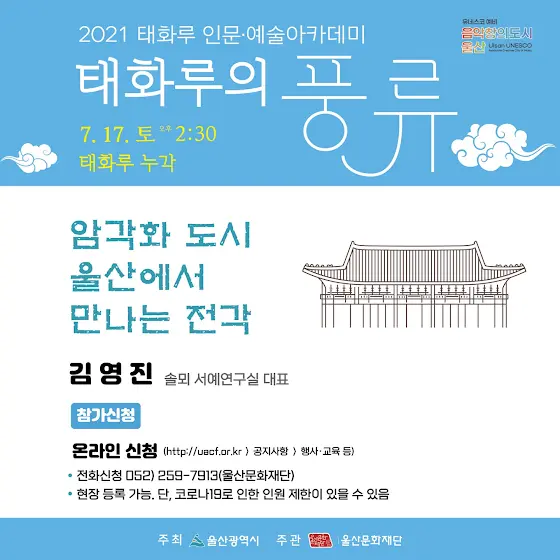 장맛비로 연일 후텁하더니 모처럼 햇살이 화창한 날이네요 울산문화재단에서 주관하는 태화루 인문예술 아카데미에 강의를 위촉받아 진행하게 되어 소식 전합니다 일정 참고하시고 시간 되는 분들 많은 참관 바랍니다 평소에 꾸준히 응원 해 주시는 모든 분들께 감사드립니다 건강 하세요 ~