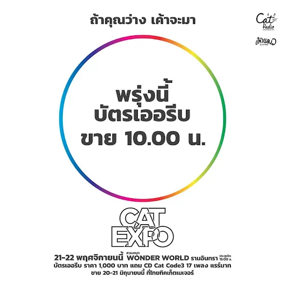 พรุ่งนี้ขายบัตรเออรีบนะจ๊ะ1,000 บาท เข้างานได้ 2 วัน ทุกใบแถม CD Cat Code 3ที่ไทยทิคเก็ตเมเจอร์ซื้อทางออนไลน์ www.thaiticketmajor.comเปิดขาย 10.00 น ส่วนที่เคาน์เตอร์ก็ตามเวลาจุดจำหน่ายจ้าจุดจำหน่ายcorporate.thaiticketmajor.com/outlet-location.phpวิธีการซื้อบัตรcorporate.thaiticketmajor.com/how-to-buy-tickets.p…ช่องทางการชำระเงินcorporate.thaiticketmajor.com/how-to-pay.php