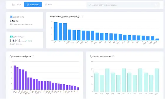 Ну а сегодня мы выпустили первую версию новой страницы - Аналитика. На этой странице вы можете посмотреть информацию как обо всём портфеле, так и о какой-то конкретной категории или акции. Конечно, над ней ещё предстоит работа, но уже сейчас я, например, понял, что мне нужно менять доли дивидендных акций в портфеле)) слишком медленно растут дивиденды