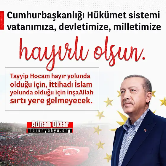 Cumhurbaşkanlığı Hükümet sistemi vatanımıza, devletimize, milletimize hayırlı olsun. Tayyip Hocam hayır yolunda olduğu için, İttihadı İslam yolunda olduğu için inşaAllah sırtı yere gelmeyecek.