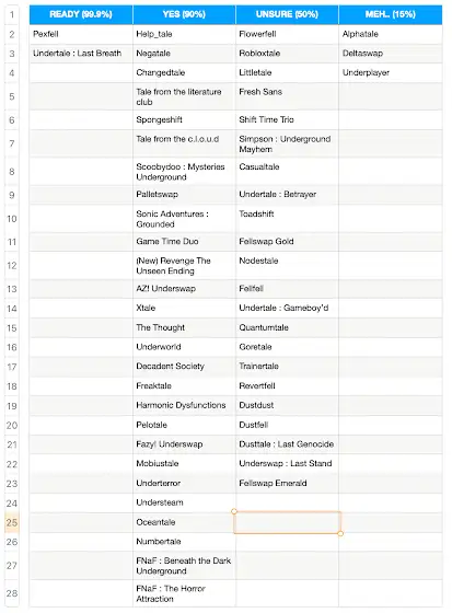 So about YFJ V3, you don't have to worry about the current progress because I haven't started the hard stuff aka the editing, it's way too soon for me as I wanna do more other things on my channel before. But I haven't been doing nothing for the past months, I've been taking your AU requests for V3, as well as searching for some myself and ordering them in terms of how likely I'd put them in. I made a table that keeps changing overtime so here's a screenshot of its actual state and if you have any AU in mind that isn't in there and you'd like it to be in, request it in the comments and I'll add it right away.