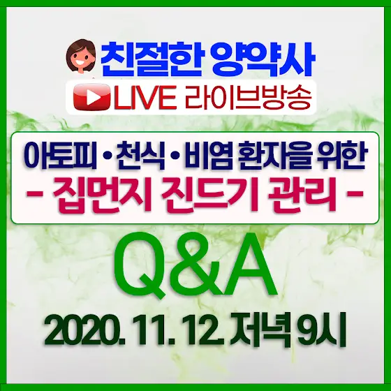 [라이브방송-Q&A] '아토피, 천식, 비염 환자를 위한 집먼지 진드기 관리' 라는 주제로 2020년 11월 12일 목요일 저녁 9시부터 생방송으로 궁금증을 공유합니다. 실시간으로 질문과 답변이 가능합니다. 많은 참여 부탁드립니다. 감사합니다.