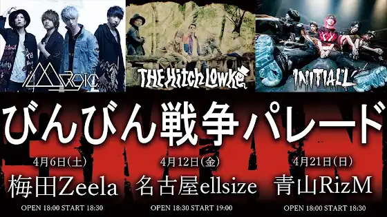 LIVE 告知【THE Hitch Lowke×iMagic.×Initial’L 3マン東名阪ツアー】『びんびん戦争パレード』4月6日▶️梅田Zeela🎫👉eplus.jp/sf/detail/2860…4月12日▶️名古屋ell.SIZE🎫👉sundayfolk.com/go/ellsize0412🎫👉eplus.jp/ellsize0412/4月21日▶️青山RizM🎫👉eplus.jp/sf/detail/2858…