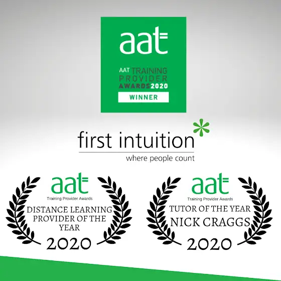 We are thrilled to announce that First Intuition Tutor Nick Craggs, tutor for our recent AAT Advanced Bookkeeping Revision series and other videos, has won ‘AAT Tutor of the Year’ and the First Intuition distance learning team have won ‘AAT Distance Learning Provider of the Year’ at the AAT Awards 2020!