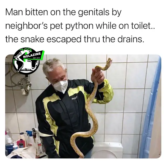 The 65-year-old man was nipped by the 5-foot-plus albino reticulated python about 6 a.m. Monday as he sat down in the bathroom.neighbor had 11 nonvenomous constrictor snakes in his apartment. He also had a geckos.Authorities are now investigating the snake’s owner on suspicion of negligently causing bodily harm, police said.