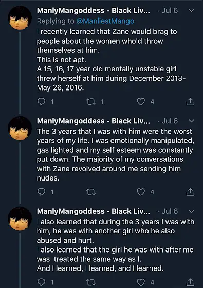 A lot has come out about him this week, and I feel it’s my duty as a victim of this monster to come out as well. I’m not active in this community anymore, but many may remember ZaneAMV from Re-Evo (sanevada, nerore93, novaGAMV). We “dated” in 2010-2011 when I was just in high school, and his misogyny and abuse of womxn were just as prevalent then as they are today. This man has not changed, he is a sociopath, a pathological liar, known to request nudes from UNDERAGE GIRLS, is mentally abusive, and is a serial cheater. Please if you know him cut ties with him, don’t allow your cis lady friends near him, he will not change. He is not different. My heart goes out to all his victims, and I commend your bravery for coming out about it this week. To anyone that thinks our trauma and pain is something that he’s allowed to move on from, that you can ignore for some weird friendship? Fuck. You. I received permission from Mango to share this thread of theirs, so thank you. Stay safe all, the internet is forever.
