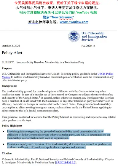 有关最新USCIS对于CCP党员绿卡申请的规定。申请人需要更加注意这方面的情况。