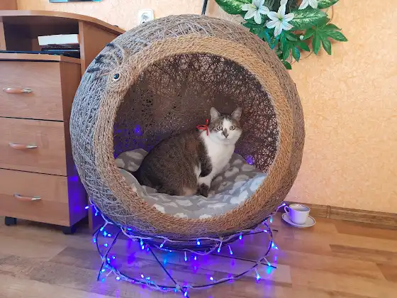Вот наш домик шар и готов)!! Обрамление из кокосовой верёвки мы прикрепили на горячий клей из пистолета и украсили чёрной пуговицой и маленькими обрезками кокосовой верёвочки,получилось как голова попугая с глазом) Подставку я немного занизил, она мне показалась слишком высокая,да и Люше легче в неё заходить, чем запрыгивать;) Смотрите полное видео на моём канале,коментируйте, всем отвечу,и ставте лайк Люле и мне за мои старания по созданию второго домика по вашим просьбам))) Всем хорошего дня 👍