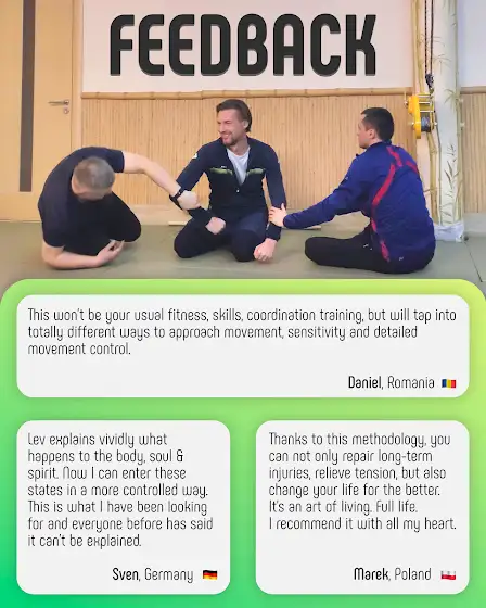 То, чему учит Лев - фундаментально новый подход к работе с телом. Будучи в области спортивной науки 30 лет, я могу засвидетельствовать, что это будет не обычный фитнес или тренировка навыков и координации, но совершенно другие способы подхода к движению, чувствительности и детальному контролю движений.