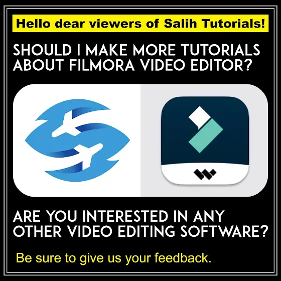 Hello dear viewers of Salih Tutorials! ➢ Should I make more tutorials about Filmora Video Editor? ➢ Are you interested in any other video editing software?Be sure to give us your feedback.@FilmoraWondershare