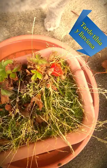 Una tarde lluviosa y tibia, nada más de pensar que es grato estar en el hogar a punto de degustar la primera fresa de la temporada en compañía de un amigo que se unió a la foto, tengan un buen resto de jornada