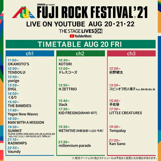 フジロック公式チャンネル CHANNEL 2にて8/20(金)19:30より生配信