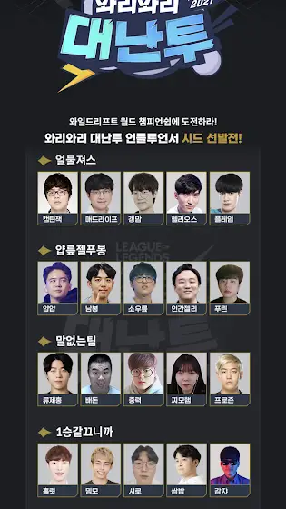 안녕하세요, 감쟈입니다!🥔'와리와리 대난투' 드선 선발전에 제가 참가합니다!(리그오브레전드 와일드리프트 대회)🔴이번 월, 화 (2~3일) 저녁7시에 생방송!!-1승갈끄니까- 멤버@밍모 @holit92 @official_Siro @SSAMBOBtv @감쟈 서폿으로 참가했어요! 우승가즈아~~(1주일만에 골3 찍은 나 천재..?)