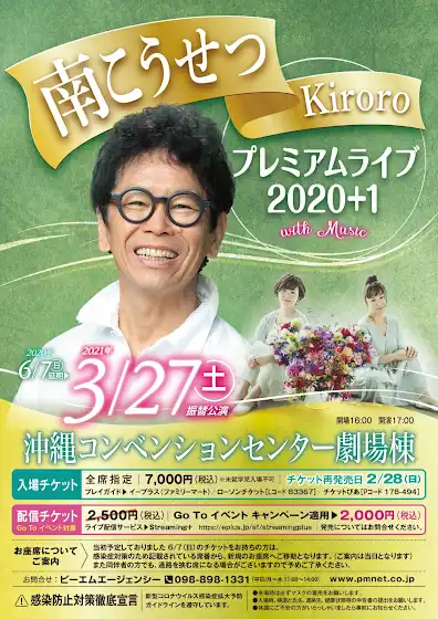【LIVE情報】2021年3月27日(土)開催「南こうせつ・Kiroro プレミアムライブ2020+1」@沖縄コンベンションセンター劇場棟開場16:00/開演17:00 チケット再発売中! ライブ配信もございますので、ぜひチェックして下さい♪■詳細はこちらwww.pmnet.co.jp/live/2020/kosetsu_kiroro/