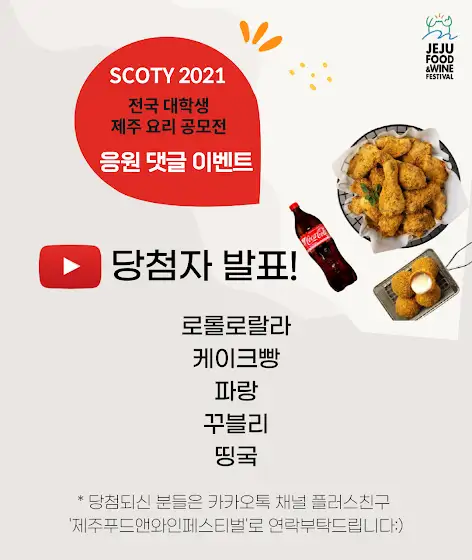 [SCOTY2021: 전국 대학생 제주 요리 공모전] 🍗댓글 남기고 치킨 먹자🍗 <응원 댓글 이벤트> 당첨자 발표정성스러운 댓글 남겨주신 모든 분들께 감사드리며, 앞으로도 제주푸드앤와인페스티벌 많은 관심 부탁드립니다!