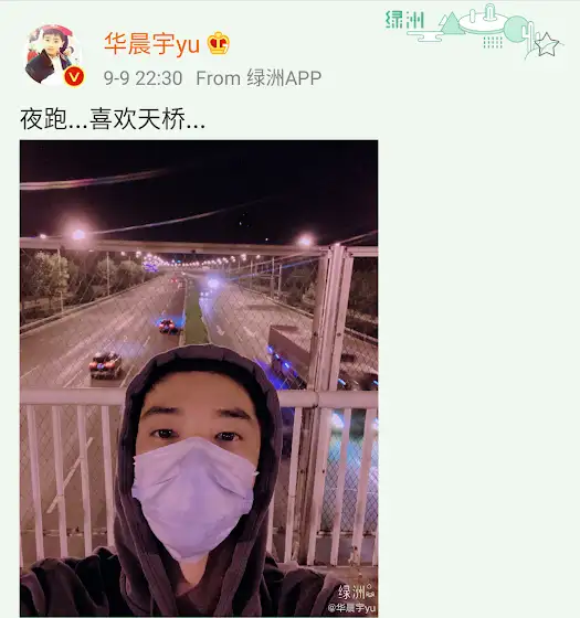 [花花🌹更新微博 Update Weibo]2020-09-09 22:30夜跑...喜欢天桥...Cr : Weibo微博@华晨宇yu