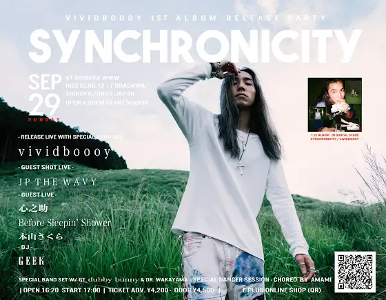 2019.9.29 SUN. vividboooy 1st Album "SYNCHRONICITY" Release Party @shibuya WWW- RELEASE LIVE -vividboooy (BAND SET)- GUEST SHOT LIVE -JP THE WAVY- GUEST LIVE -心之助Before Sleepin' Shower本山さくら- DJ -GEEKOPEN 16:20/START 17:00 ALL STANDING ¥4,200 add 1drink- BUY TICKET -eplus.jp/sf/detail/3022510001INFO:SOGO TOKYO 03-3405-9999