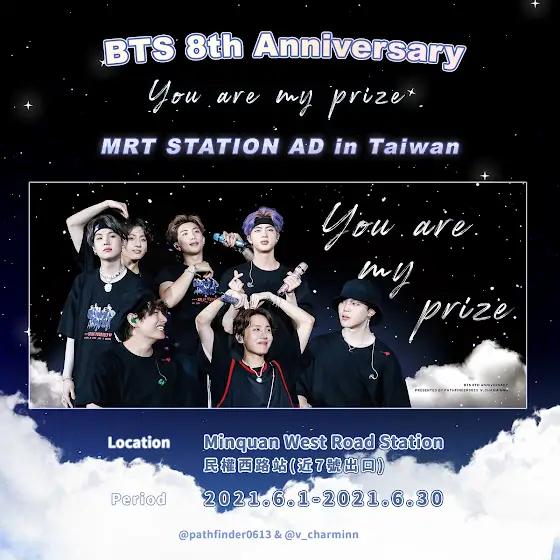 🏆 BTS 8th Anniversary: You are my prize 🏆 “My prize, my trophy.” 燈箱順利上刊啦~ 謝謝所有參與集資的阿米✨✨詳情請點→【www.facebook.com/pathfinder06... 】⚠️重要事項⚠️因應近期疫情嚴峻,請大家待疫情趨緩後再前往,此燈箱刊期為整個六月, 若燈箱旁人潮聚集也請與他人保持社交距離並務必戴上口罩。 此應援活動從今年四月就開始籌備也已簽約付訂金,因此無法取消或延期, 若有通勤上班上課者有可能會經過民權西路站的話,再順道前往觀看。