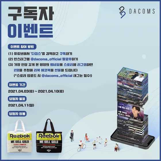 3. 다컴스 인스타 게시물 중 가장 인상 깊게 본 영상의 썸네일을 개인 스토리에 올려주시면 추첨을 통해 리복 에코백을 선물로 드립니다!