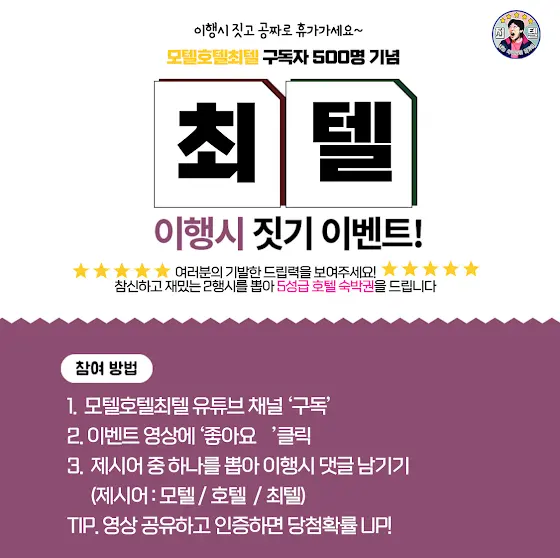 안녕하세요. 모텔 호텔 최텔입니다! 구독자 500명 이벤트 당첨자를 발표하겠습니다! 당첨자는 바로! 🏆<조니버스>🏆님이십니다. 센스 있는 2행시와 저희 채널과 영상을 열심히 공유 및 시청해주셔서 정말 감사합니다! 그리고, 한 분 더! 특별상! 특별상 수상자는 바로! 🏆<체리>님 이십니다!! 축하합니다. 늘 최텔을 향한 응원과 지지 그리고 조언을 아끼지 않으시는 체리님 정말 감사합니다! 이번에 이벤트에도 열심히 참여해주셨습니다!